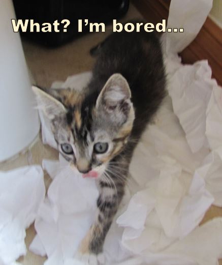 Most everyone knows I have a touch of OCD, but lately I’m wondering about my increasing lack of attention to any one thing. I’ll read while watching the news (and yelling at the news), then I’ll switch over to one of my games (Bingo, Word Serenity or Match to Win) or I’ll scroll through Facebook, Twitter, and e-mail, all while petting at least one of my attention starved cats. My wife vacillates between amusement and irritation over the amount of time I spend on these games. When I was addicted to Kitten Match, I would play all day, so I had to delete that app. Unfortunately, these games pay cash and I’m hooked, thinking the next scratch or win will be the big one for me! I dream of waking my wife up one morning, shouting that I just won a thousand dollars. But, what is evident to me is that I gravitate to the next shiny object. Eventually, I am sure I’ll delete these games and find something else to satisfy my miniscule attention span. I’m not sure if my cat, Nicky, takes after me, or I take after her. We joke about Nicky being our little ADHD kitty because she is constantly getting into something. It’s like she’s bored and just looking to get into trouble.