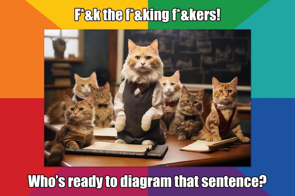 That got me thinking how many words can be used as nouns, verbs, adverbs, and adjectives and there is actually another blog on this where the person listed fifty-six words. Rather than list all of them for you, I thought I would simply provide a link to that blog: https://onweb3.wordpress.com/2013/08/14/663/. You gotta love the versatility of the English language. Although, writing this blog I had nightmares about diagramming sentences. Hint: I was never very good at it! I’m not even kidding about this…I had nightmares the very night I was pondering writing about this topic. You know the drill if you want to see how many different ways I’ve used various profanity as nouns, verbs, adverbs, or adjectives. Just click the links below!